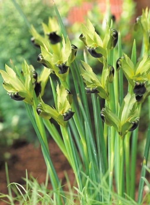 黄緑と黒のコントラストが印象的なスネークヘッドアイリスとも呼ばれる球根植物です。