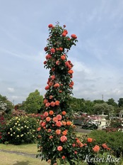 待望の濃いオレンジのつるバラです。つるバラにはあまりない鮮やかなオレンジ色の花は褪色しにくく、房になって咲きます。うどんこ病や黒星病に強いです。寒さに当たると枝に黒いしみが出来ますが、病気ではなく生育に問題はありません。