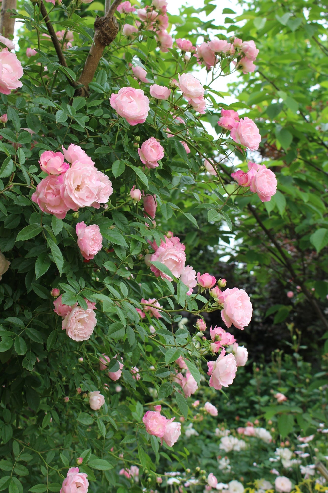 「珠玉(しゅぎょく)」の枝変わり。ピンクがかすり状に入るコロンとした可愛らしい花を大房で咲かせ、低温期には色が濃くなる。花付き、花持ちが良く、毎年枝の節々から花を咲かせ、満開時は花で株が覆われるほど。春以降も主に秋に返り咲く。枝はトゲが少なく、しなやかで誘引しやすいため、オベリスク、アーチなど様々な仕立てに向く。
