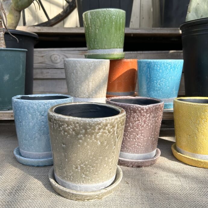 豊富な色展開を誇るカラーポット。単調な色使いになりがちなガーデニングアイテムも、色とりどりのカラーポットを加えることで華やかな、心浮き立つコーディネートが可能に。屋内のインテリアのポイントにもなります。表面のクラックや色むらも味わい深い、何とも可愛いポット達。
