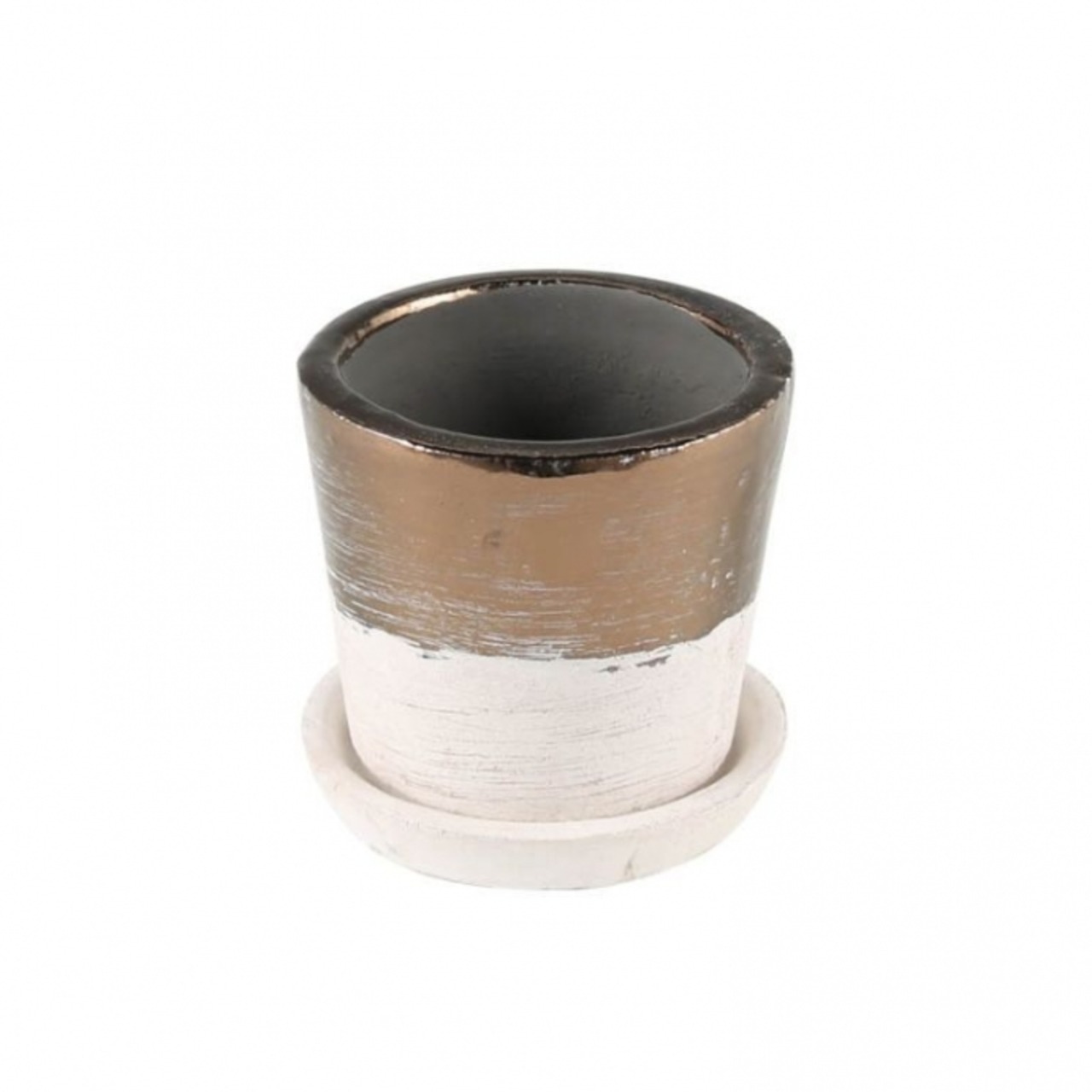 素材を生かしたベーシックな色と華やかなブロンズのツートンカラーが魅力のポット。テラコッタ素材は通気性が良く、ソーサーも付いているので、室内でオブジェとしても楽しめます。ハンドメイドで一点一点異なる風合いも魅力的。お好みの植物を植えてあなたのグリーンライフにアクセントを。
